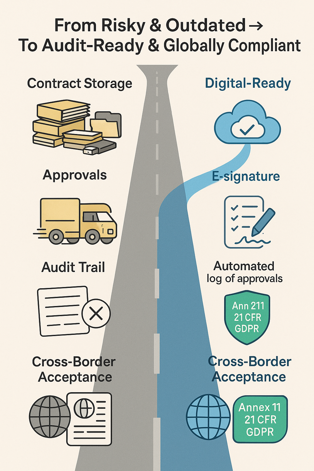 - Manual approvals → couriered signatures and long approval chains that feel outdated to global partners.
