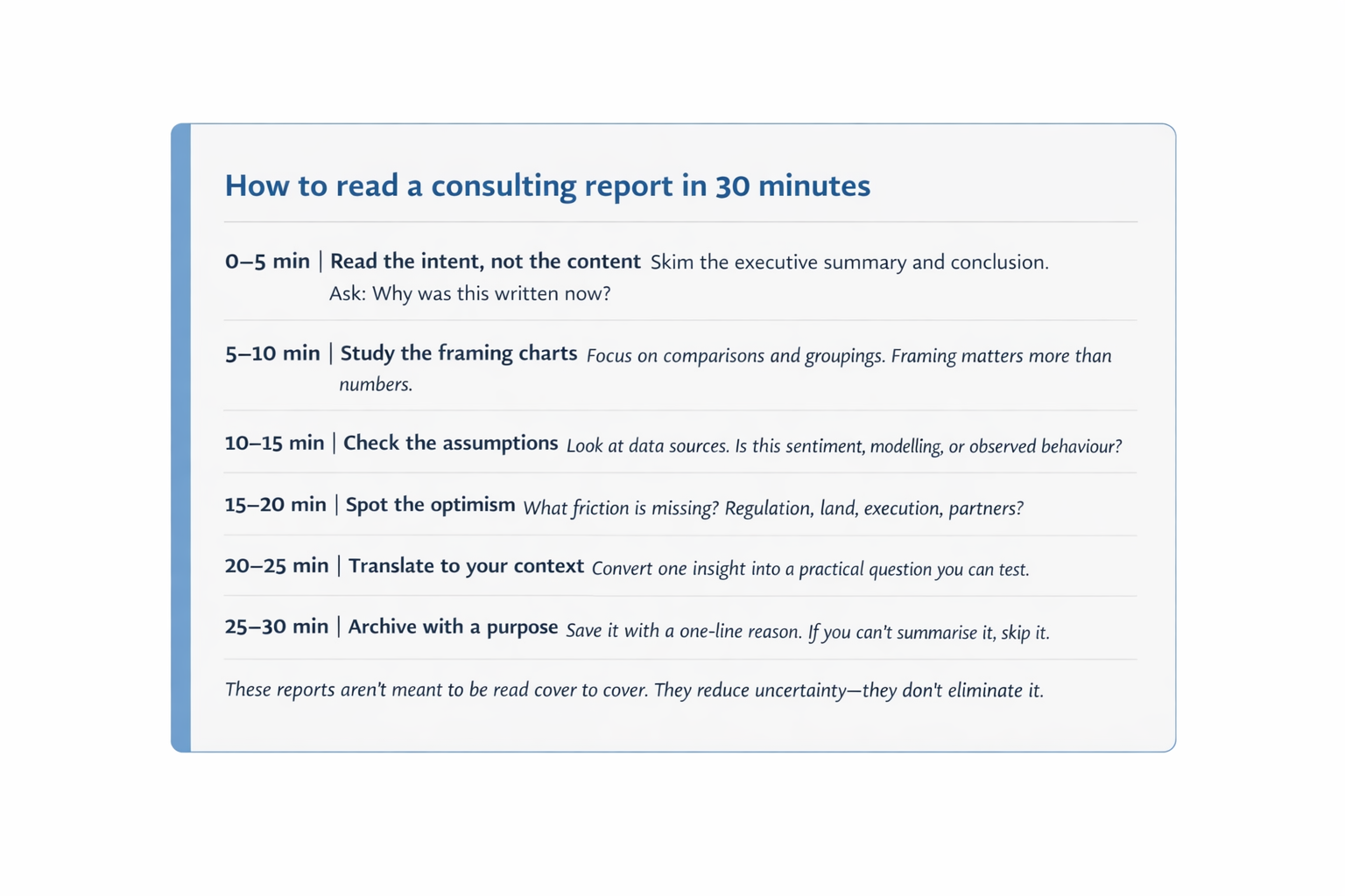 The most effective way to use these reports is not to read them end to end, but to extract framing, question assumptions, and test relevance against reality. Done well, that takes about half an hour.